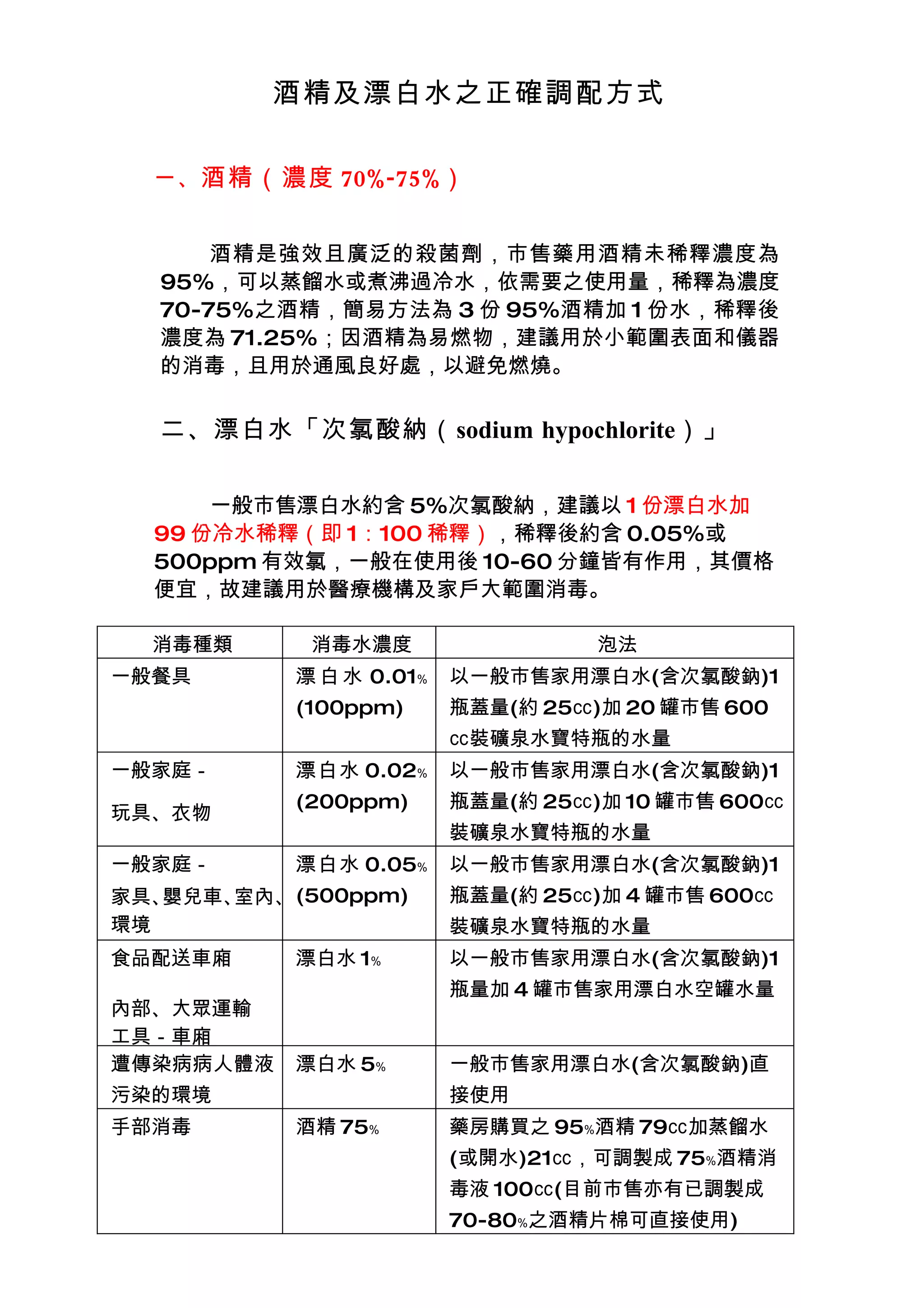 酒精及漂白水之正確調配方式