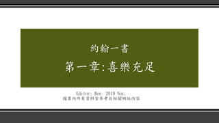 约翰一书第一章强调生命之道是通过耶稣基督实现的真理与光明,指出与神相交的条件是行在光明中,并在此基础上获得喜乐。书中批判了当时流行的诺斯底主义,强调信仰与行为的重要性,并呼吁信徒在道德上自省和承认自己的罪。整体上,约翰一书旨在加强信徒对信仰的理解及其生活的实践。