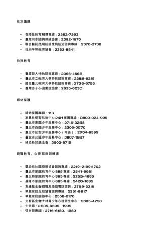 • 友緣基金會親職及婚姻電話諮詢:2769-3319