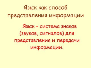 Коды и кодированиеКод – это система условных знаков для представления информации. Кодирование – это перевод информации в удобную для передачи, обработки или хранения форму с помощью некоторого кода.