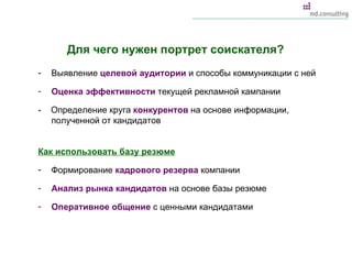 Выявление целевойаудитории и способы коммуникации с ней Оценка эффективности текущей рекламной кампании - Определение круга конкурентов на основе информации, полученной от кандидатов Как использовать базу резюме Формирование кадрового резерва компании Анализ рынка кандидатов на основе базы резюме Оперативное общение с ценными кандидатами Для чего нужен портрет соискателя?