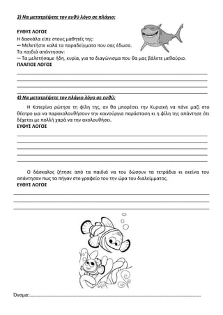Εξάσκηση στη μετατροπήευθύ λόγου σε πλάγιο και το αντίστροφο.