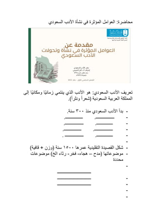 تتناول المحاضرات الأدب السعودي وتطوره عبر العصور، بدءًا من الشعر التقليدي إلى الشعر الحديث والنثري، مع تسليط الضوء على أبرز أعلامه مثل محمد عواد ونازك الملائكة. كما تستعرض العوامل التي ساهمت في نهضة الأدب السعودي، مثل الاستقرار السياسي والتعليم والدعم الثقافي. تشمل المواضيع الشعرية في الأدب السعودي التقليدي والتجديدي، وتطور المضمون لمواكبة القضايا الاجتماعية والوطنية.