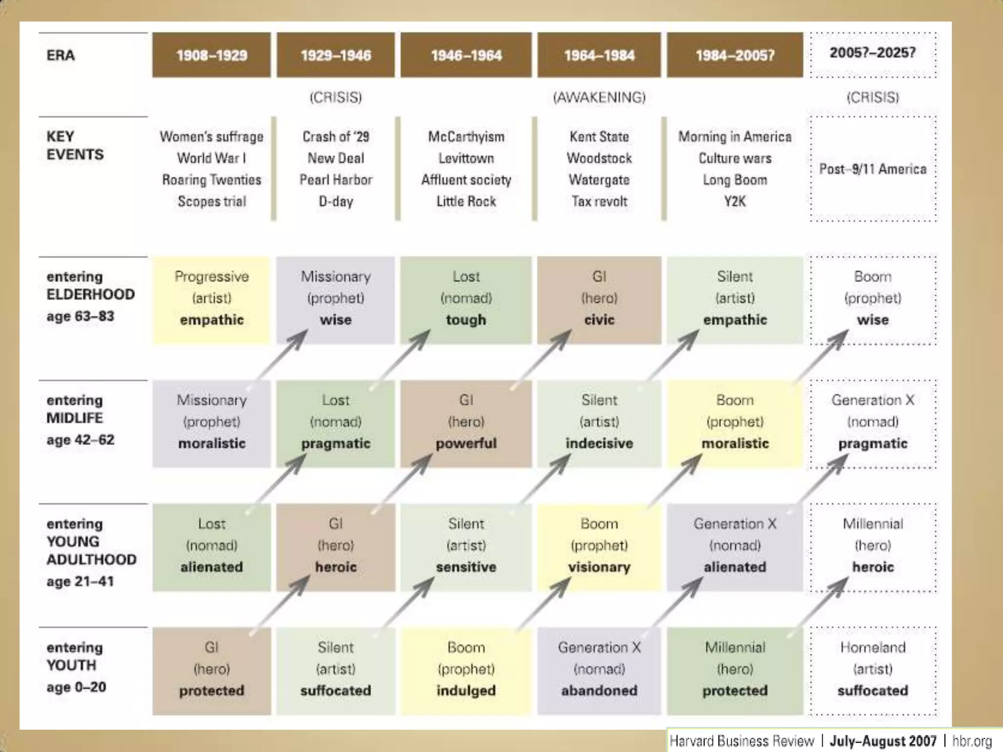 Документ рассматривает теорию поколений Страуса-Хоу, обсуждая влияние исторических событий и культурного контекста на формирование ценностей разных поколений. Основные архитекторы теории выделяют четыре архетипа: Пророк, Кочевник, Герой и Художник, каждый из которых вносит уникальный вклад в общество. Также обсуждаются характеристики и ценности поколений Y (1985-1994) и бэби-бумеров (1946-1963), подчеркивая важность социальных связей, автономности и стремления к креативности.