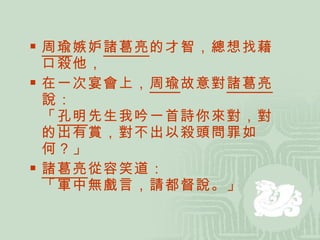 的才智,總想找藉口殺他, 在一次宴會上, 周瑜 故意對 諸葛亮 說: 「 孔明 先生我吟一首詩你來對,對的出有賞,對不出以殺頭問罪如何?」 諸葛亮 從容笑道: 「軍中無戲言,請都督說。」