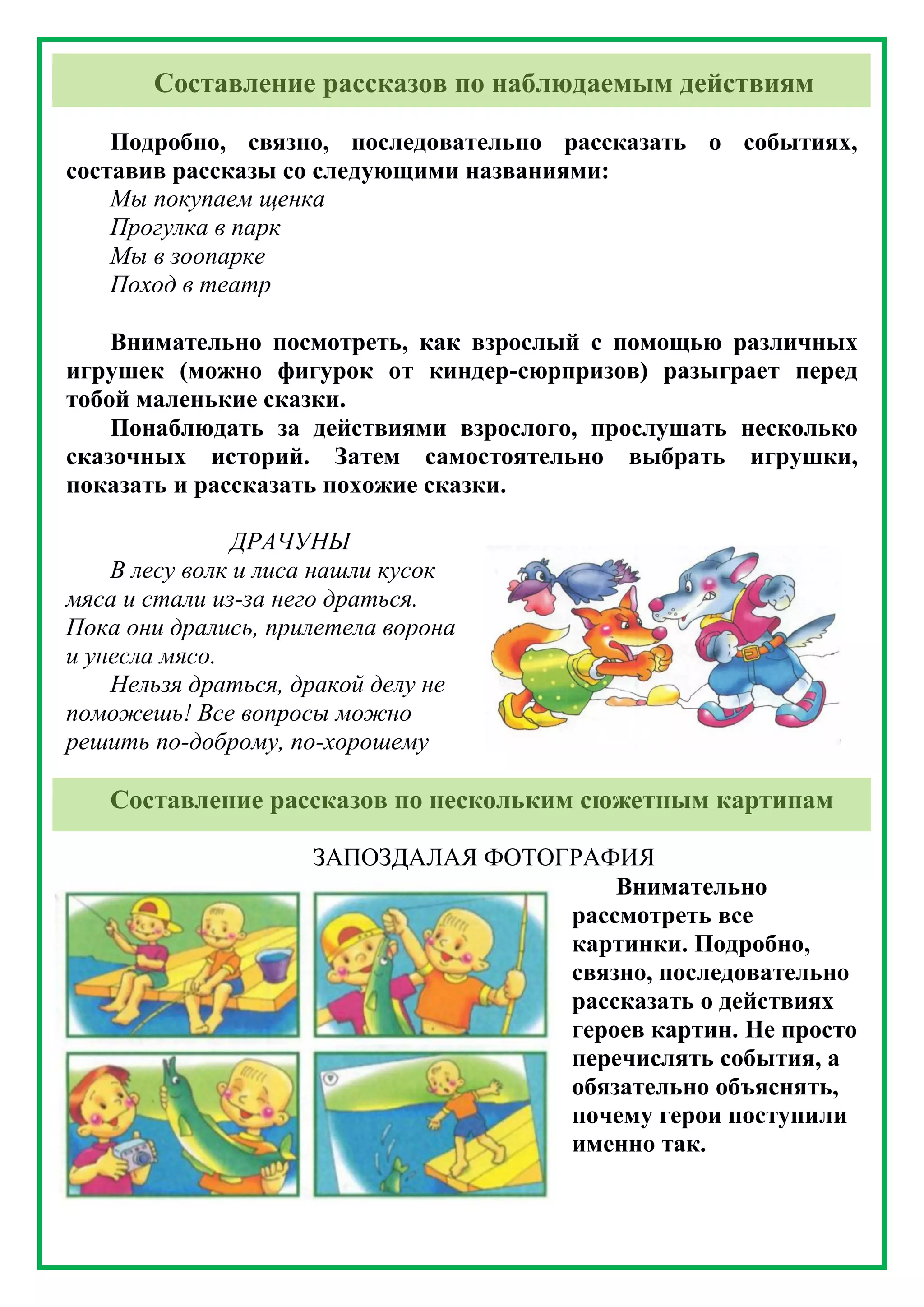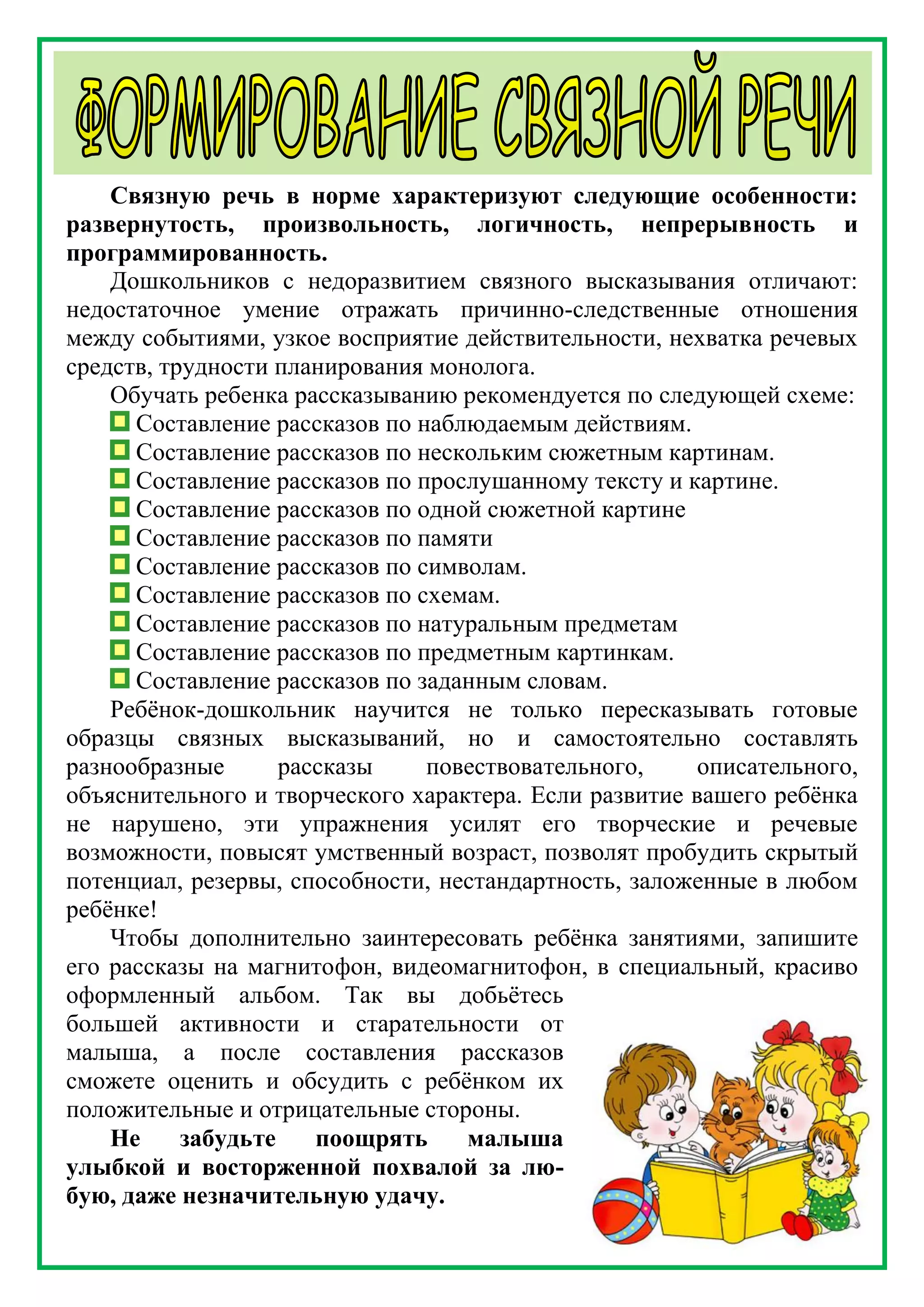 Документ описывает особенности связной речи у дошкольников и методы обучения составлению рассказов. В нем представлены различные схемы для развития навыков рассказывания, включая составление рассказов по наблюдениям, сюжетным картинам, прослушанным текстам и другим методам. Обсуждаются способы повышения речевых возможностей детей, включая поощрение и активное участие в процессе.