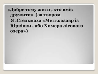 Презентація до уроку української літератури, проведеного 11.04.2013 року у 6-Б класі. Учитель - Молнар Ганна Василівна. Тема уроку:"Добре тому жити, хто вміє дружити" (за твором Я. Стельмаха "Митькозавр із Юрківки, або Химера лісового озера").