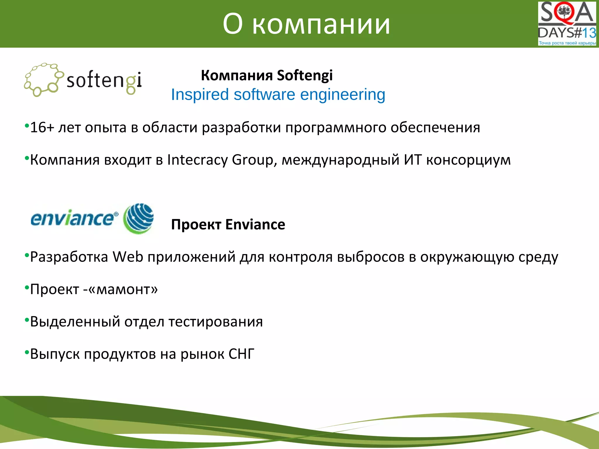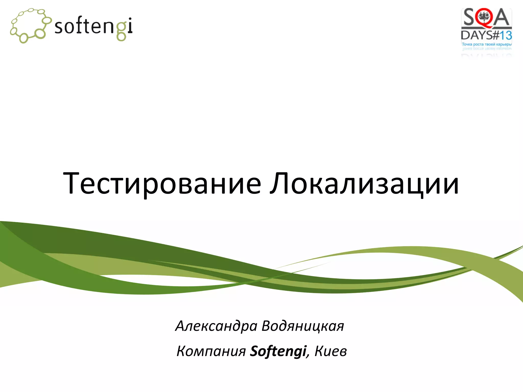 Документ представляет собой обзор тестирования локализации, проведенного компанией Softengi, с акцентом на важность адаптации программного обеспечения для различных культур и языков. Описываются методы и параметры тестирования, включая перевод текста, форматирование, и особенности отображения данных, а также стратегии интернационализации продуктов. Также упоминаются проекты компании и опыт команды в данной области.