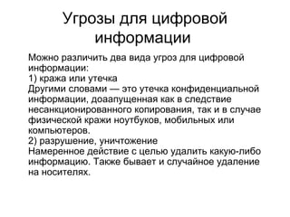 Документ обсуждает важность защиты информации в цифровом формате, выделяя основные угрозы, такие как кража данных и разрушение информации. Он также описывает методы, используемые для защиты данных, включая антивирусные программы и брандмауэры, а также меры предосторожности, которые следует соблюдать в компьютерных классах. Особое внимание уделяется необходимости резервного копирования и соблюдению правил безопасности при работе с компьютерами.