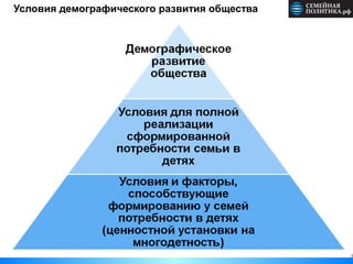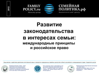 Документ обсуждает развитие законодательства в интересах семьи, акцентируя внимание на международных принципах и российских правовых нормах, защищающих семейные ценности. Подчеркивается важность естественной семьи как основы общества, а также необходимость законодательно ограничить вмешательство государства в семейные дела. Рассматриваются проблемы правоприменения в России и предлагаются меры для улучшения семейной политики на региональном уровне.