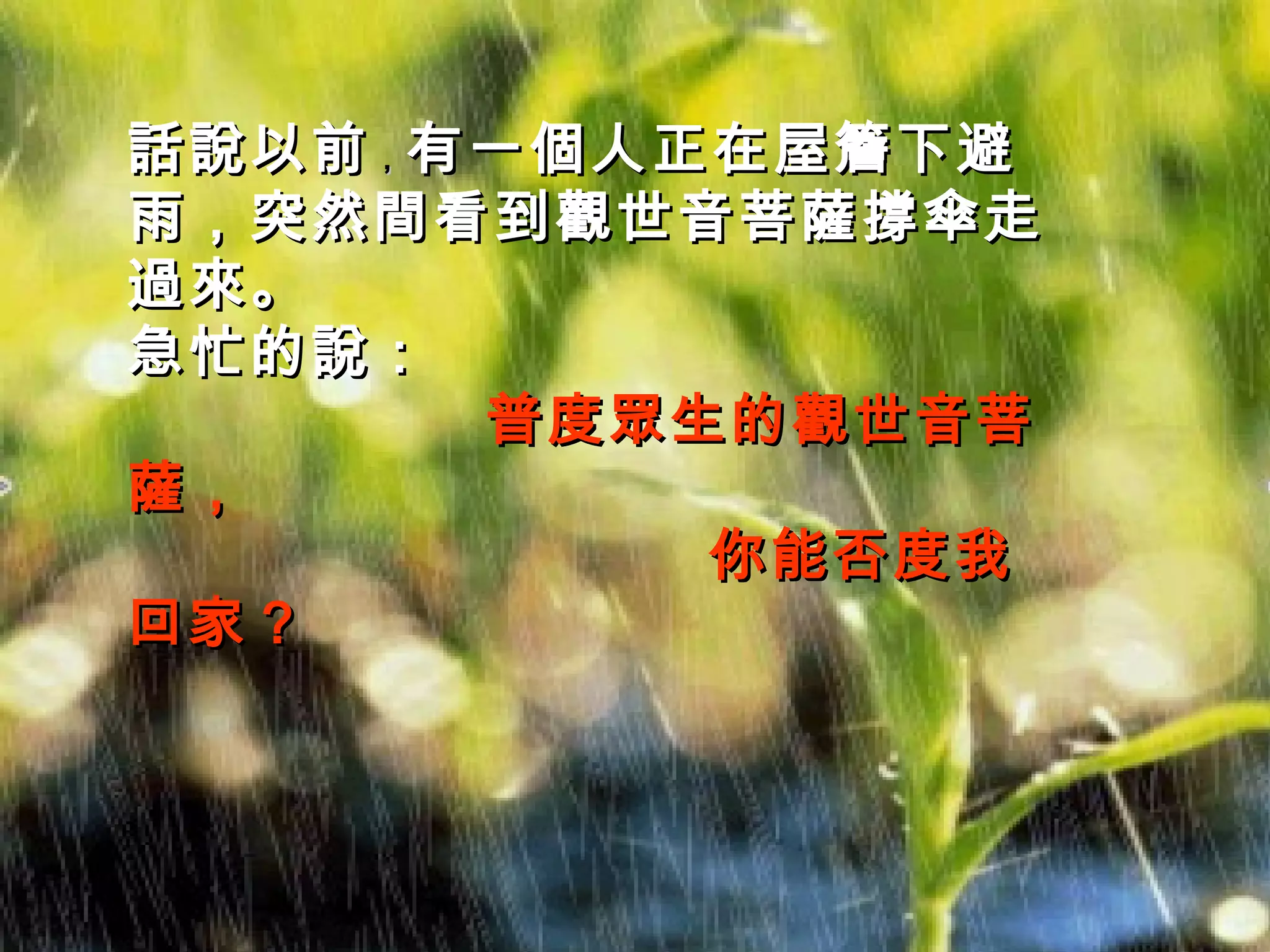 話說以前 , 有一個人正在屋簷下避雨,突然間看到觀世音菩薩撐傘走過來。