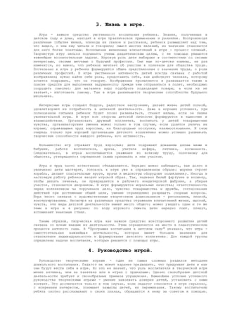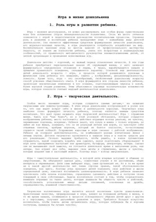 Документ рассматривает важность игры в развитии дошкольников, подчеркивая ее роль в формировании личности, моральных качеств и творческих способностей. Игра является не только способом усвоения общественного опыта, но и средством социальной и нравственной адаптации ребенка, позволяющим ему взаимодействовать с окружающим миром и сверстниками. Также акцентируется необходимость профессионального подхода воспитателей к организации игровых процессов для создания благоприятной атмосферы обучения и воспитания.