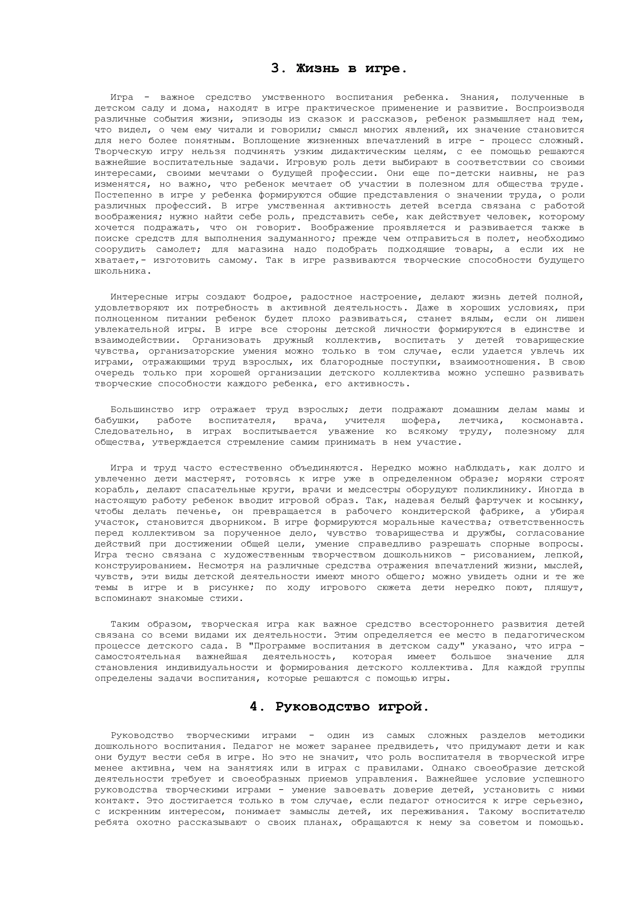Документ рассматривает значимость игры в развитии дошкольников, подчеркивая ее роль как основной формы детской деятельности, способствующей формированию личности и морально-волевых качеств. Игра рассматривается как творческая деятельность, отражающая жизнь и помогающая детям в общении со сверстниками, а также в усвоении общественного опыта. Кроме того, текст акцентирует внимание на важности педагогического руководства игрой, которое способствует организации игрового процесса и выделению воспитательных целей.