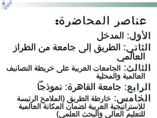 تناقش المحاضرة التحديات التي تواجه الجامعات العربية في تحقيق مكانة متميزة عالميًا، مشيرةً إلى تخلفها عن التصنيفات المتقدمة. كما تستعرض الأبعاد المختلفة المتعلقة بتحسين جودة التعليم العالي والبحث العلمي في هذه الجامعات، وتطرح مقترحات لضمان تحقيق المراكز العالمية. التركيز هو على ضرورة تطوير استراتيجيات فعالة لتحسين الأداء الأكاديمي والبحثي.