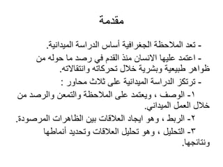 تتناول الوثيقة الدراسة الميدانية كأداة أساسية في الجغرافيا، حيث تركز على ثلاثة محاور رئيسية: الملاحظة، الربط، والتحليل. توضح الوثيقة مراحل الدراسة الميدانية، بدءًا من تحديد الأهداف وجمع المعلومات المكتبية، إلى تطبيق البحث الميداني وتحليل النتائج. تستخدم الدراسة مجموعة متنوعة من الأدوات والأساليب العلمية لجمع البيانات المتعلقة بالظواهر الجغرافية المختلفة.