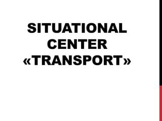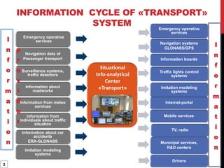 The document describes a proposed situational center for transport called "Transport" that would integrate information from various transportation systems and emergency services to provide real-time traffic and transportation updates. It would collect data from navigation systems, traffic detectors, weather services, and individuals to analyze the transportation situation and support decision making. The center would utilize hybrid intelligent systems to process diverse data sources and help transition to a new level of situational analysis. A team is proposed to lead the development, and a development plan and funding needs are outlined to create and test a prototype for the system.