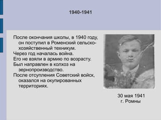 Документ описывает жизнь прадедушки автора, Петра Андреевича Козаченко, который родился 30.06.1925 и умер 22.10.2010. В годы Второй мировой войны он был направлен на принудительные работы в Чехословакии и позднее служил в армии, принимая участие в боевых действиях до конца войны. Он пережил обвал на шахте и был ранен в боях за Одру, а демобилизован был в 1947 году.