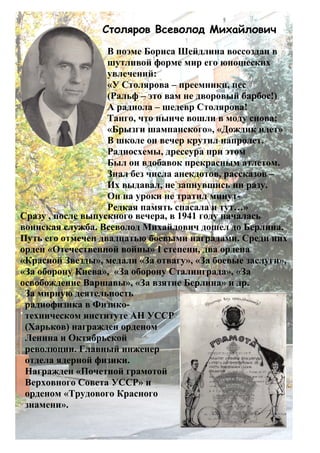 Всеволод Михайлович Столяров, изображенный в шутливой форме в поэме Бориса Шейдлина, был разносторонним человеком с юношескими увлечениями в музыке и спорте. Во время службы в армии он достиг значительных успехов, получив двадцать боевых наград, включая ордена и медали за храбрость и военные заслуги. После войны продолжил карьеру как радиофизик, был награжден высокими государственными наградами за свою мирную деятельность.