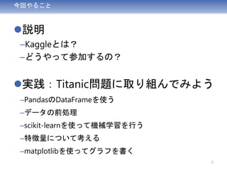 今回やること 説明 –Kaggleとは? –どうやって参加するの? 実践:Titanic問題に取り組んでみよう –PandasのDataFrameを使う –データの前処理 –scikit-learnを使って機械学習を行う –特徴量について考える –matplotlibを使ってグラフを書く 2