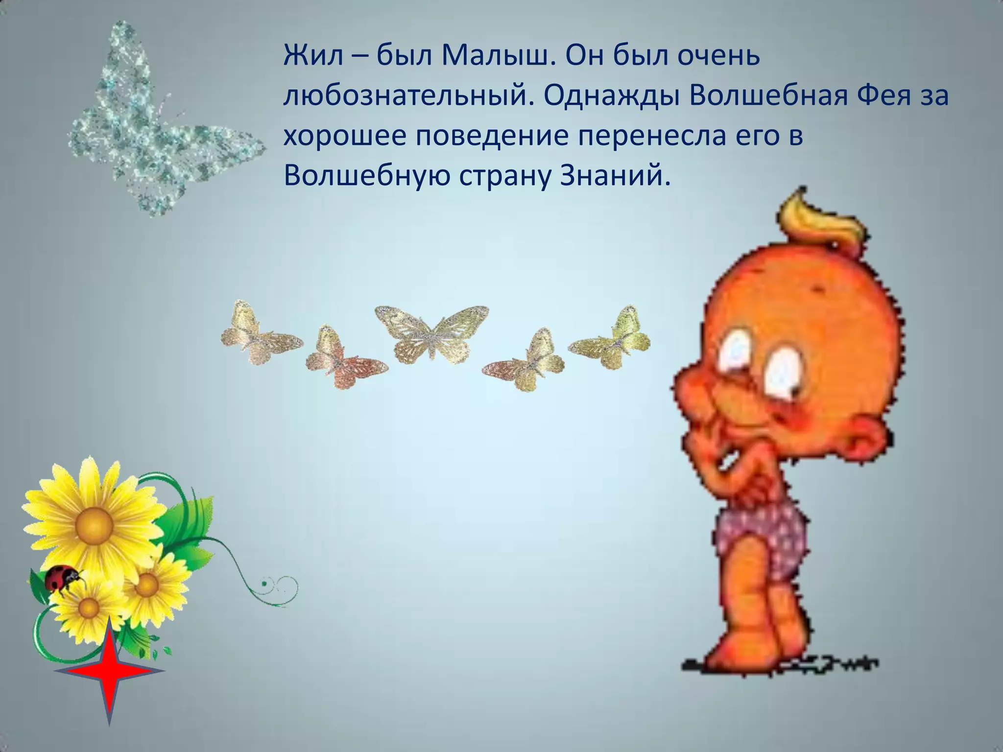 Малыш, любознательный герой, попадает в волшебную страну знаний благодаря фее за хорошее поведение. В своем путешествии он решает загадки и помогает жителям города навести порядок. В конце он получает подарок от феи за свои старания.