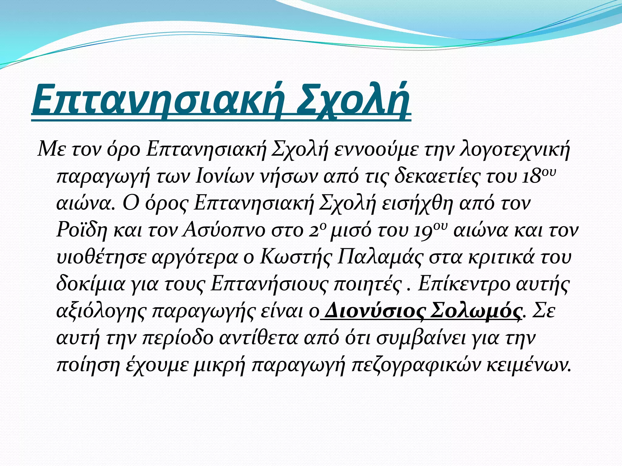 Κυρύαρχη μορφό τησΕπτανηςιακόσ ςχολόσ υπόρξε ο Διονύςιοσ Σολωμόσ