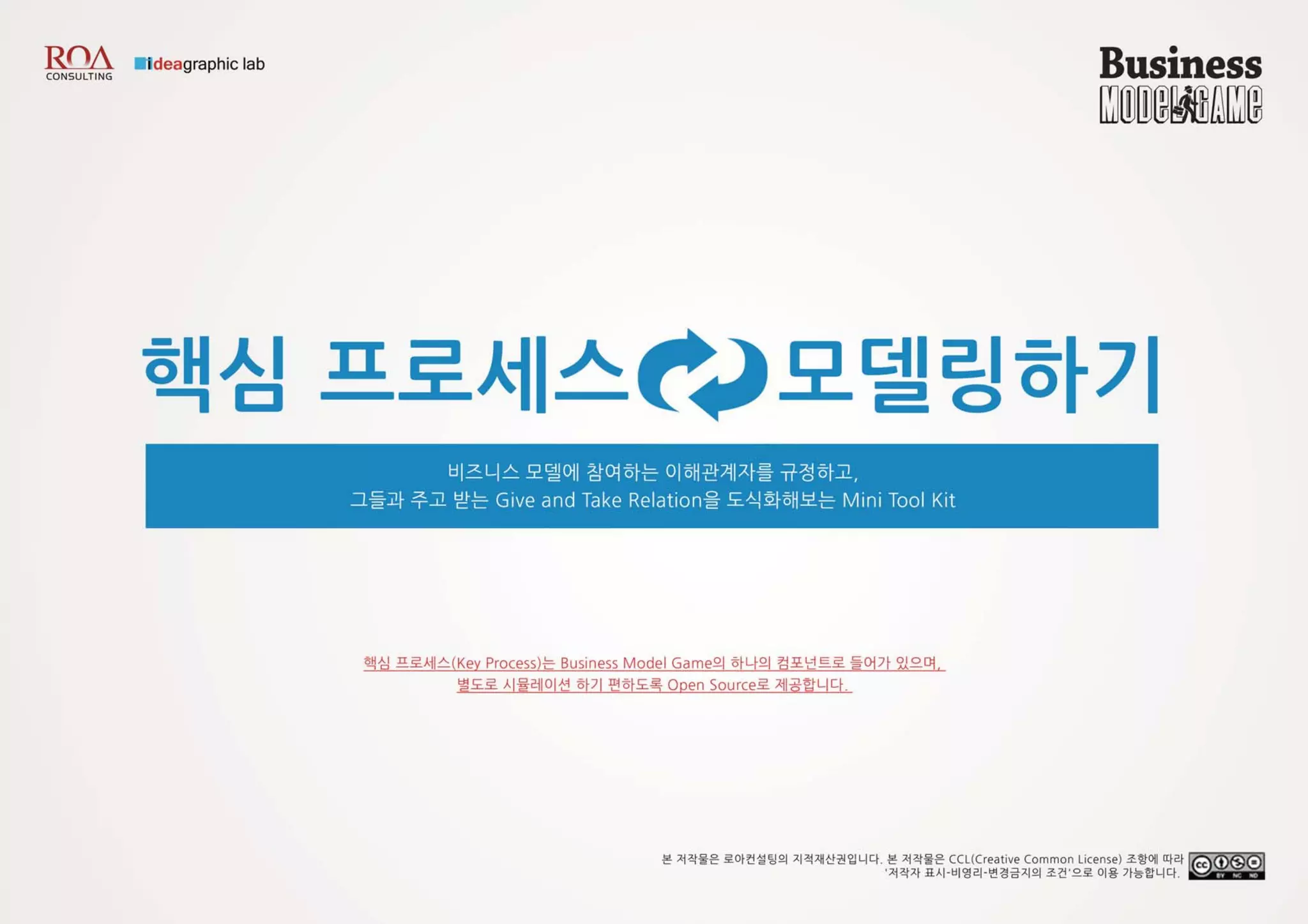 핵심 프로세스(Key Process) 모델링은 Business Model Game에서 다루는 component 중 하나로, 사업모델에 참여하는 이해관계자를 규정하고, 그들 간에 발생하는 정보의 흐름및 구조 등을 규정하는 도식화된 프로세스 구조도입니다. 제시되는 가이드라인에 따라 여러분의 사업모델의 흐름도를 만들어 보세요. outside pitch와 사업계획서 작성시 많은 도움이 될 겁니다.