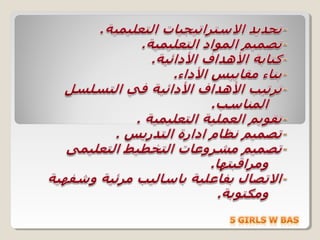 الوثيقة تتناول جهود تطوير المواد التعليمية والتكنولوجية من خلال تحليل وتصميم محتوى المقرر الدراسي. تشمل العناصر الأساسية تعاون المعلمين مع الخبراء، وتحديد الاستراتيجيات المناسبة للتعليم، وتقييم الأدوات المستخدمة من قبل المعلمين والطلاب. كما تسلط الضوء على أهمية التدريب المستمر لتلبية احتياجات المعلمين والمتعلمين في بيئة تعليمية متقدمة.