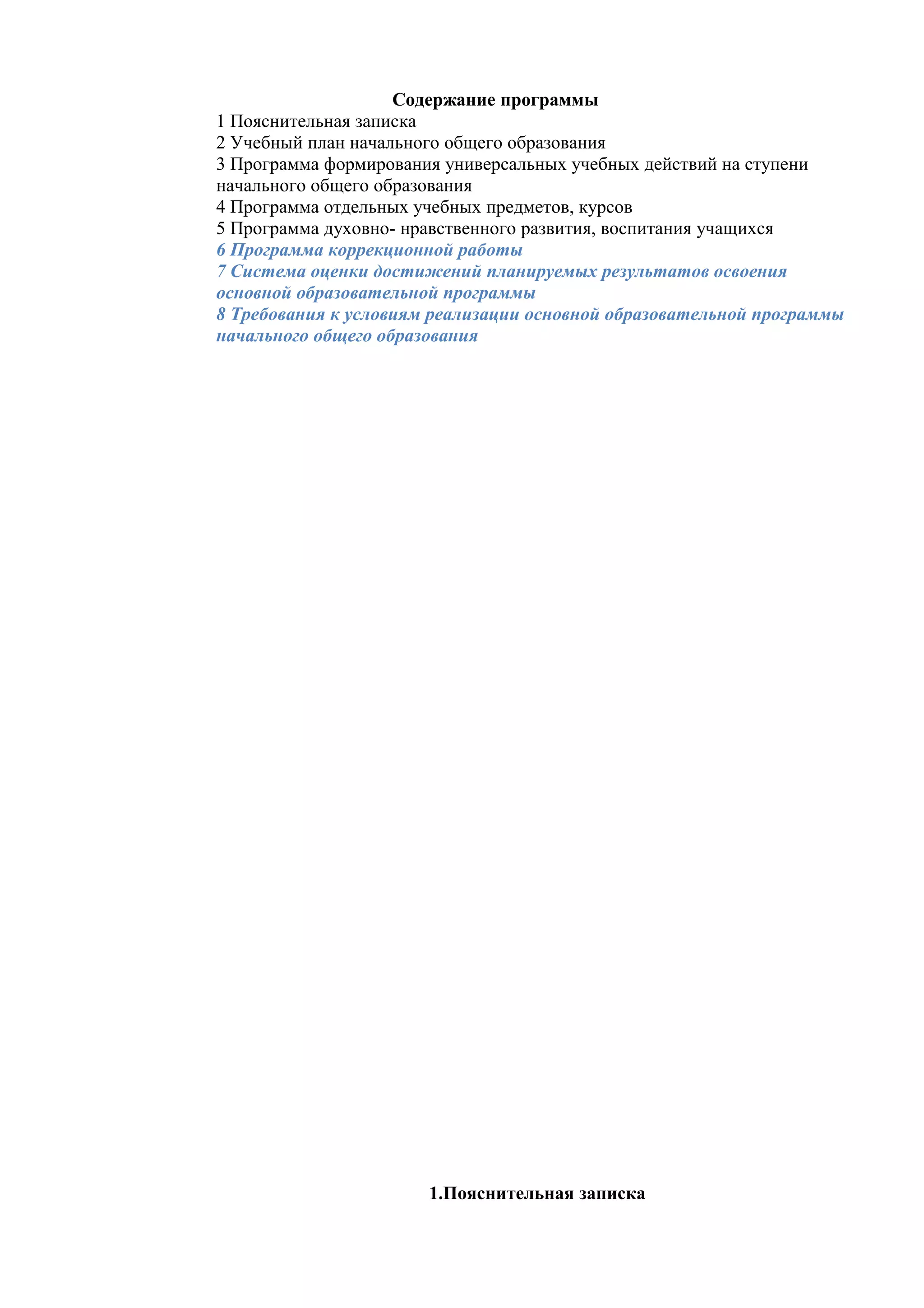 Документ представляет программу начального общего образования, разработанную в соответствии с ФГОС. Она направлена на целостное развитие личности, формирование универсальных учебных действий и комфортную образовательную среду. Программа учитывает социальные условия, потребности учащихся и включает в себя различные предметные области с целью повышения уровня образованности и подготовки их к последующим ступеням обучения.