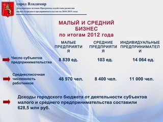 Документ описывает долгосрочную целевую программу содействия развитию малого и среднего предпринимательства в городе Владимире на 2010-2015 годы. Программа включает поддержку финансового, имущественного и консультационного характера, а также мероприятия для повышения эффективности малых и средних предприятий в различных секторах. В документе представлены количественные показатели, меры поддержки и результаты реализации программы за истекшие годы.