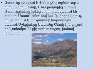 • Սասունը գտնվումէ Վանա լճից արևմուտք և