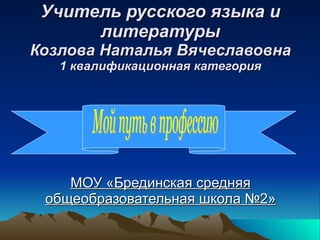 Документ представляет собой описание профессионального пути Натальи Вячеславовны Козловой, учителя русского языка и литературы в школе №2. В нем подчеркивается важность личностно ориентированного подхода в обучении, а также роль учителя как наставника и примера для учеников. Кроме того, документ включает информацию о деятельности пресс-центра школы и его цели в воспитании гражданственности и патриотизма среди молодежи.