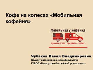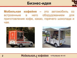 Документ описывает бизнес-идею мобильной кофейни, разработанную студентом, которая представляет собой автомобил, оснащенный оборудованием для приготовления напитков. Мобильная кофейня имеет высокую автономность и может работать в различных местах, таких как бизнес-центры и университеты, с первоначальными затратами в 14 100 у.е. Окупаемость проекта составляет 8 месяцев при условии продажи 200 порций в день.