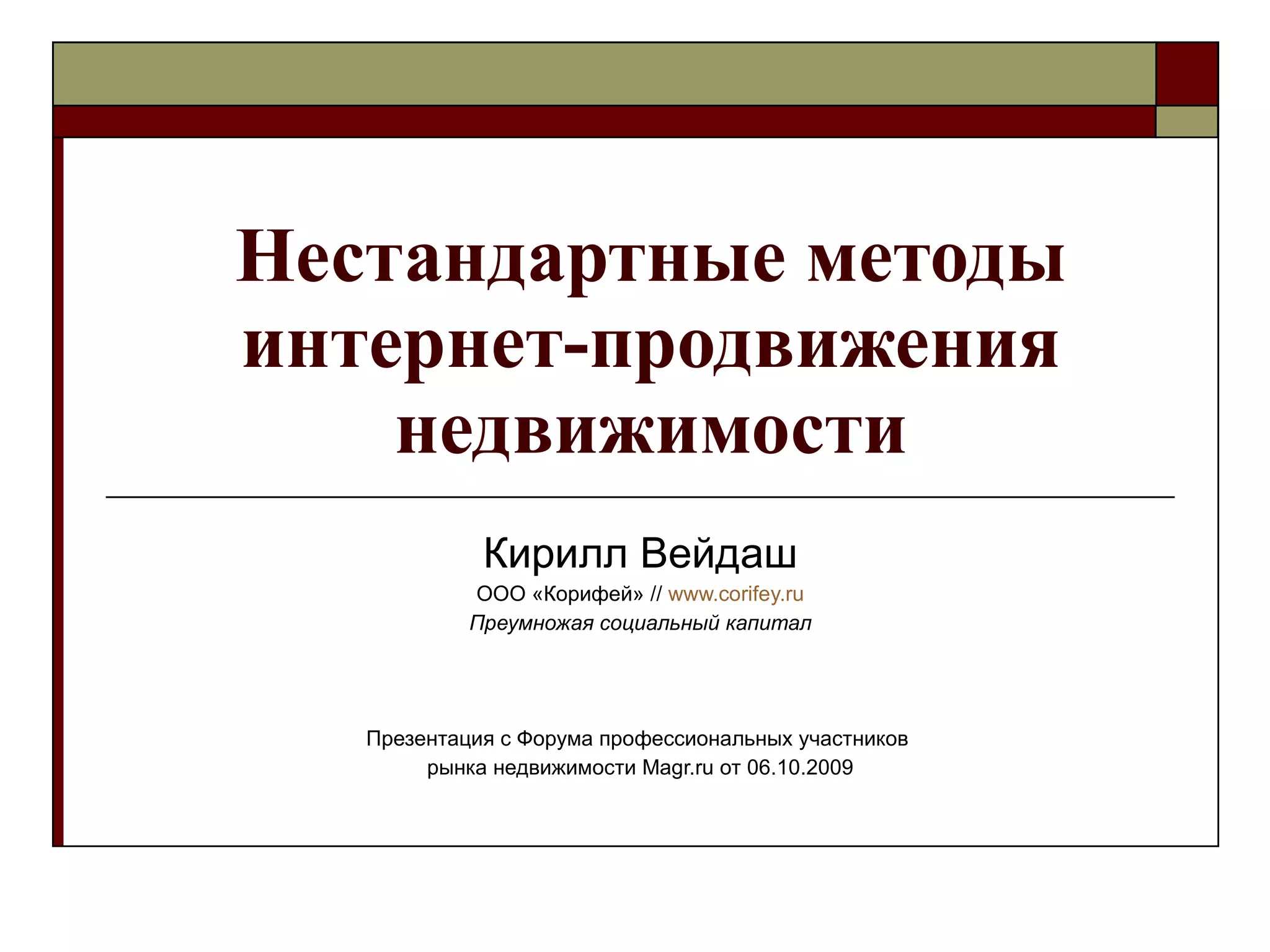 Документ освещает нестандартные методы интернет-продвижения в сфере недвижимости, обсуждая влияние социальных медиа, вирусной рекламы и микроблогов. Он подчеркивает важность экономики внимания и успешного вовлечения потребителей через различные каналы, включая контент и взаимодействие с пользователями. Также представлены статистические данные о потребительских предпочтениях и примеры успешных рекламных кампаний.