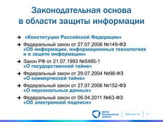 Документ описывает правовые нормы и меры защиты информации, включая коммерческую и личную тайну, в России. Указываются различные законы и регуляции, касающиеся защиты данных, а также последствия за их нарушение. Также представляются меры по организации и технической защите информации, а также услуги компании в области информационной безопасности.