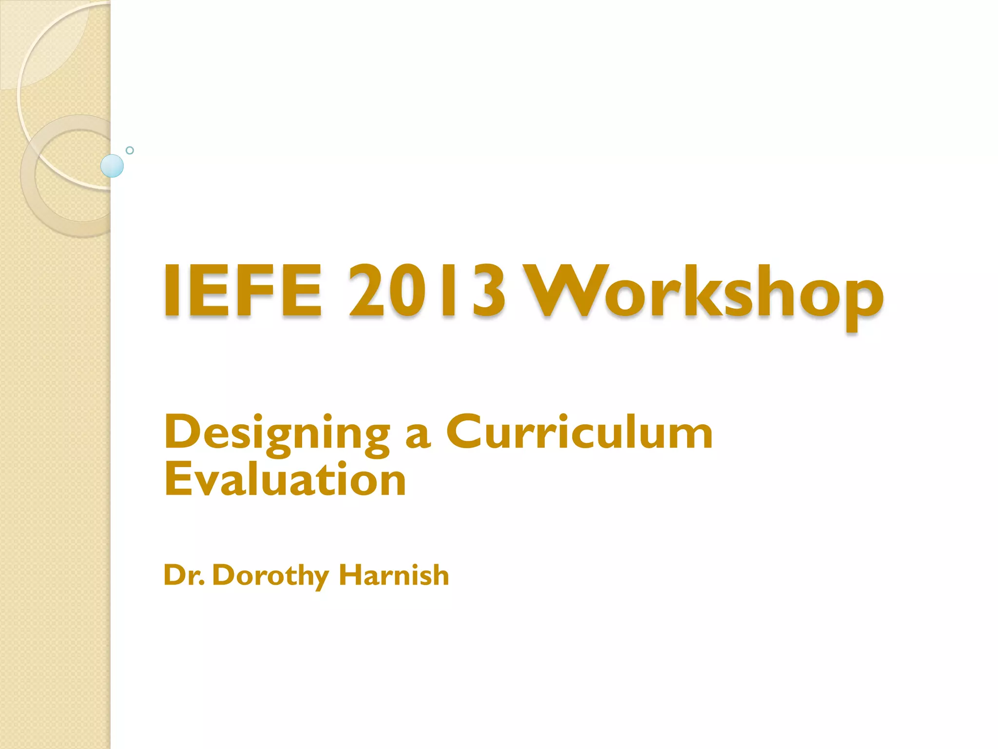 The document summarizes a workshop on designing curriculum evaluations. It provides templates and examples for developing evaluation plans with key components: evaluation questions, indicators of success, data sources, data collection methods, and data analysis strategies. Participants will use the templates to design an evaluation plan for assessing the implementation and impact of a reading program in their schools. The workshop covers qualitative and quantitative evaluation approaches to determine if program elements are being delivered as intended, whether teaching and student outcomes have improved, and the degree to which program goals are being met.