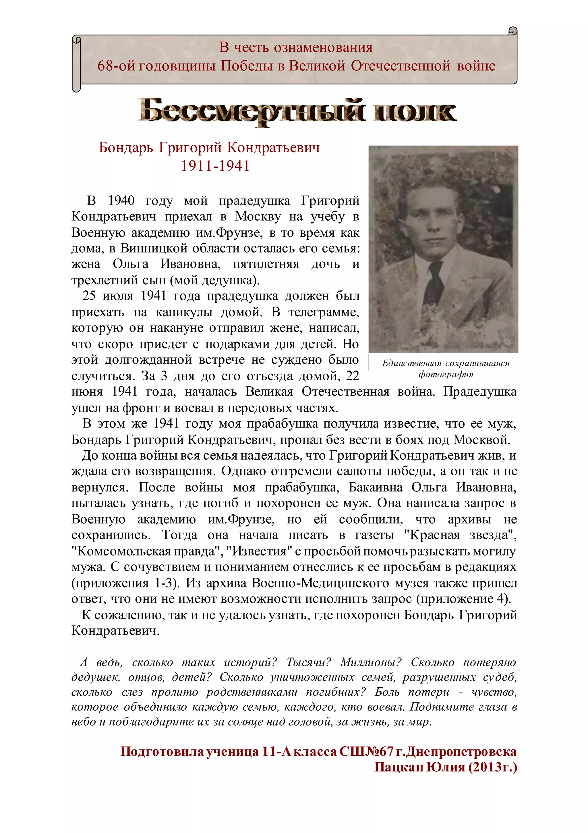 Документ рассказывает о прадедушке автора, Григории Кондратьевиче Бондаре, который ушел на фронт во время Великой Отечественной войны и пропал без вести. Его жена, Ольга Ивановна, на протяжении всей войны пыталась узнать о судьбе мужа, написав в различные организации и газеты, но безуспешно. Этот личный рассказ подчеркивает боль утраты и массовые страдания семей, пострадавших от войны.