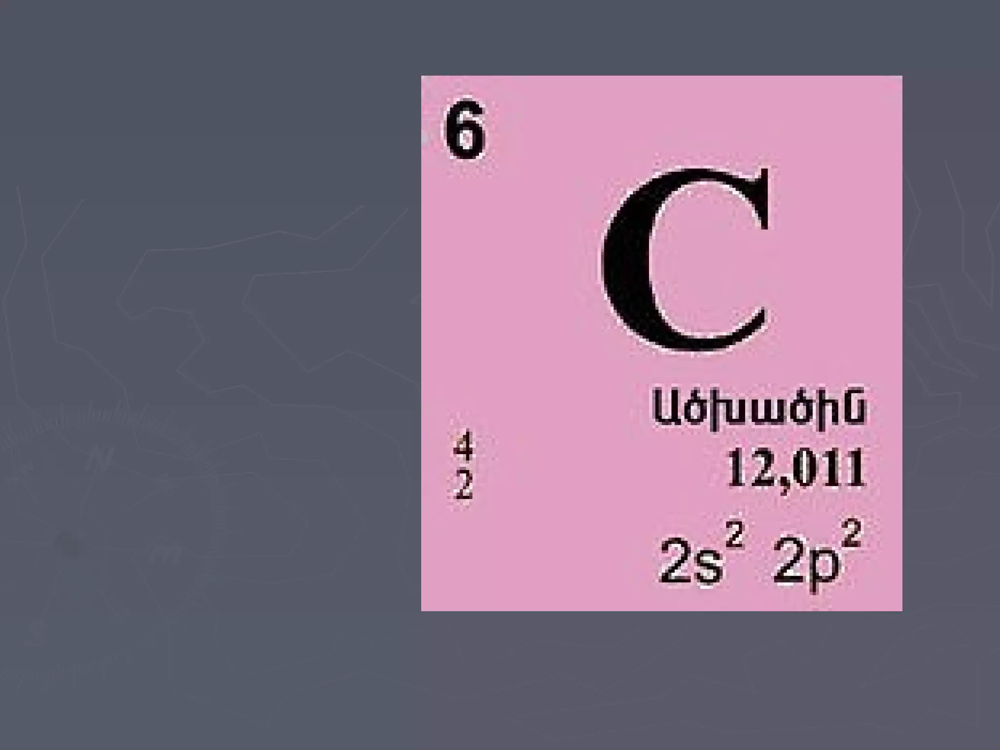 ► ԱծխածինԱծխածին (ածուխ բառից),քիմիական նշանը՝ (ածուխ բառից), քիմիական նշանը՝ CC, ատոմային թիվն է 6,, ատոմային թիվն է 6,