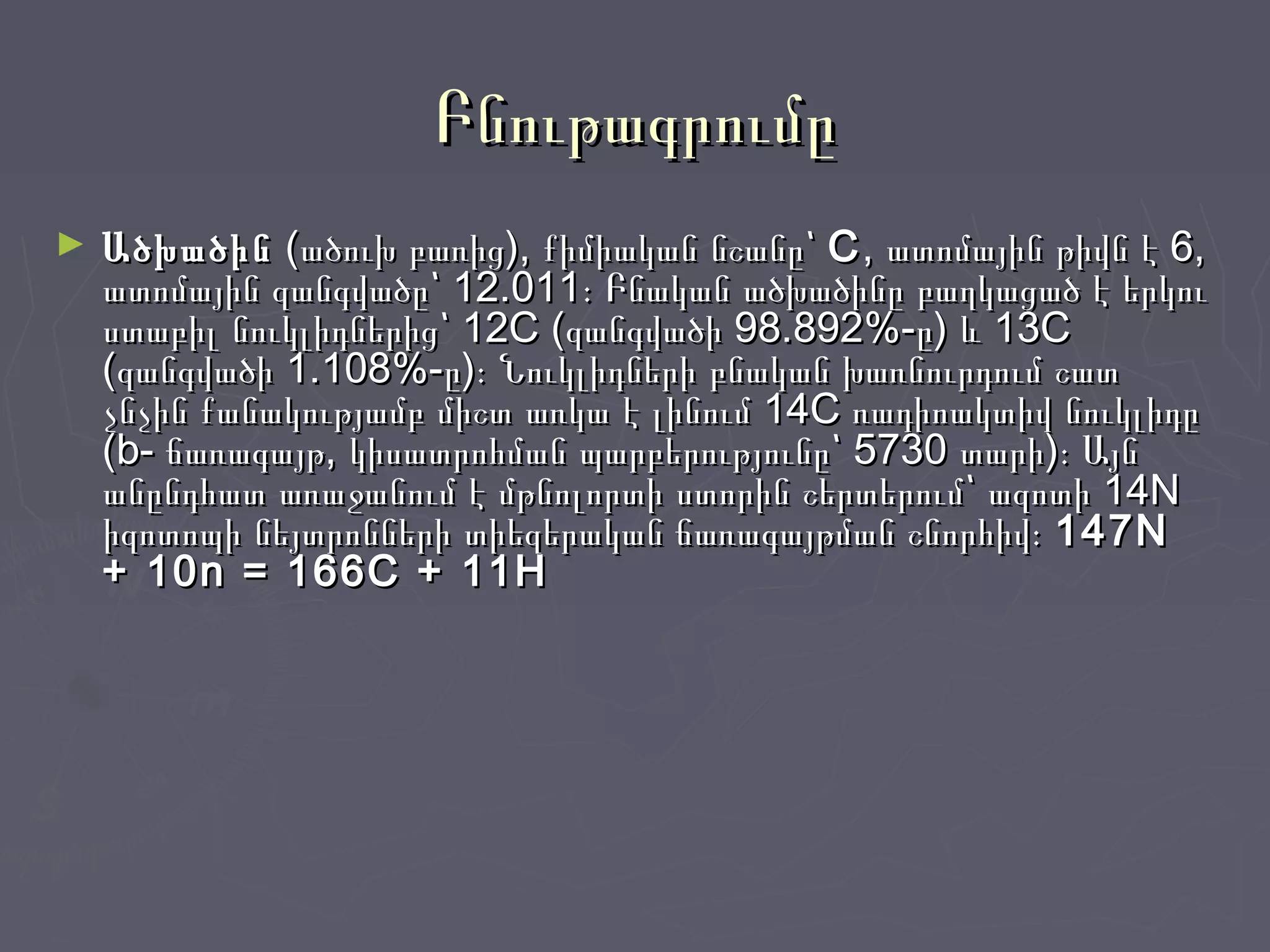 չնչին քանակությամբ միշտ առկա է լինում 14C ռադիոակտիվ նուկլիդըչնչին քանակությամբ միշտ առկա է լինում 14C ռադիոակտիվ նուկլիդը