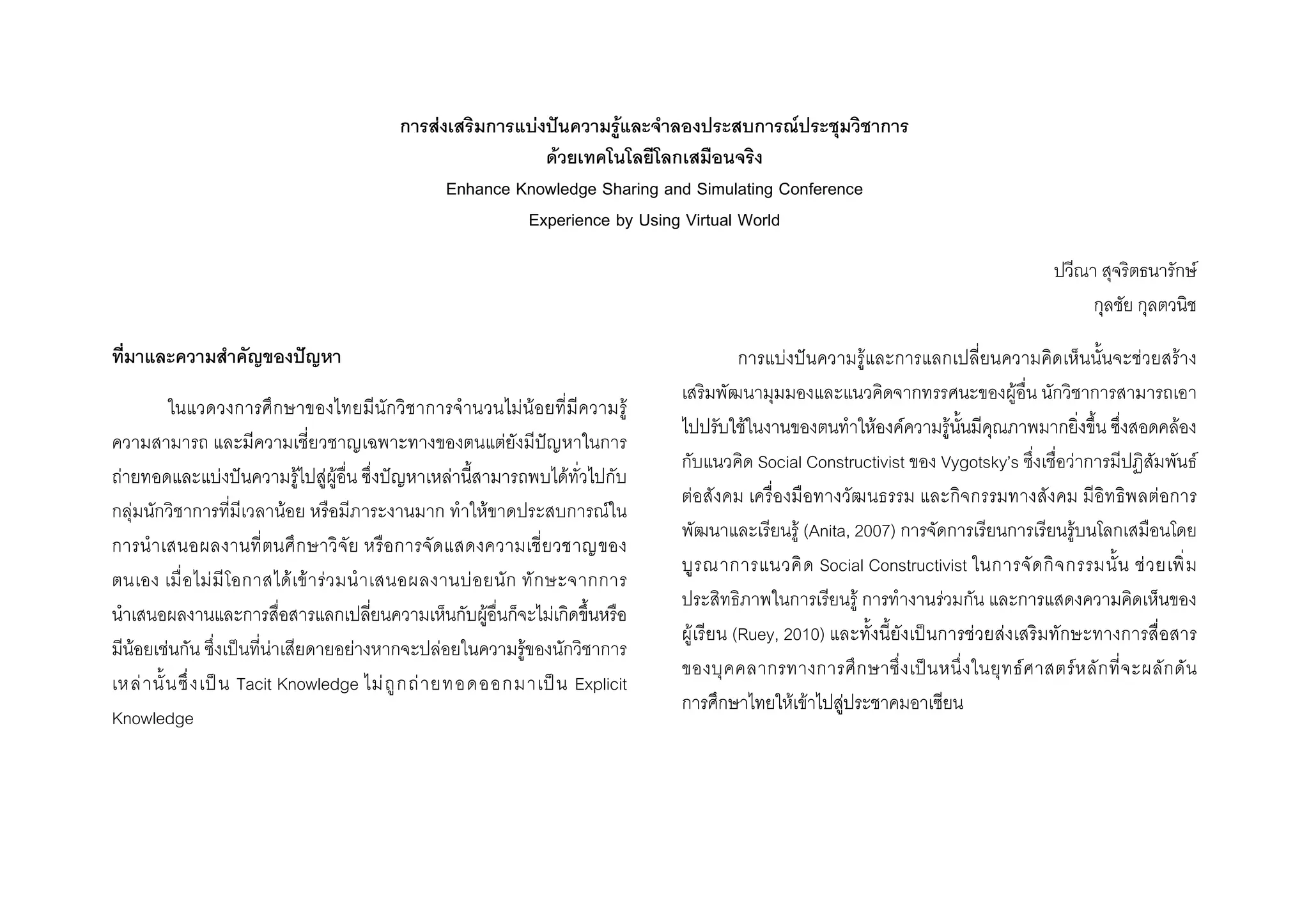 1. The document discusses using virtual worlds to enhance knowledge sharing and simulating conference experiences through a constructivist learning approach.