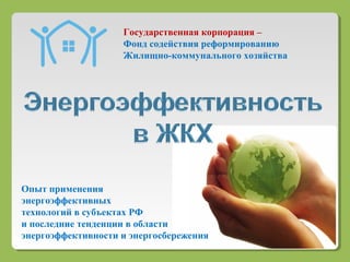 Документ описывает опыт применения энергоэффективных технологий в России, включая строительство пилотных проектов энергоэффективных жилых домов эконом-класса с использованием современных энергосберегающих решений. Приведены примеры таких домов и их характеристики, включая снижение коммунальных платежей и использование возобновляемых источников энергии. Также рассматриваются экономические показатели и преимущества применения новых технологий в строительстве и эксплуатации жилых зданий.