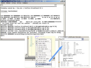사례 – 메모리침범classCTest{public:conststaticintMAX_DATA=10;intm_Data[MAX_DATA];vector<int>m_Nums;};int_tmain(intargc,_TCHAR*argv[]){CTestt;t.m_Nums.push_back(1);ZeroMemory(t.m_Data,sizeof(int)*CTest::MAX_DATA+10);t.m_Nums.push_back(1);// Crashreturn0;}#include <boost/array.hpp>int_tmain(intargc,_TCHAR*argv[]){intcArray[256];boost::array<int,5>aTest={1,2,3,4 ,5};boost::array<int,256>aArray;cArray[256]=0;// not always dieaArray[256]=0;// always die// Assertion failed: i < N && "out of range", file , line 91return0;}