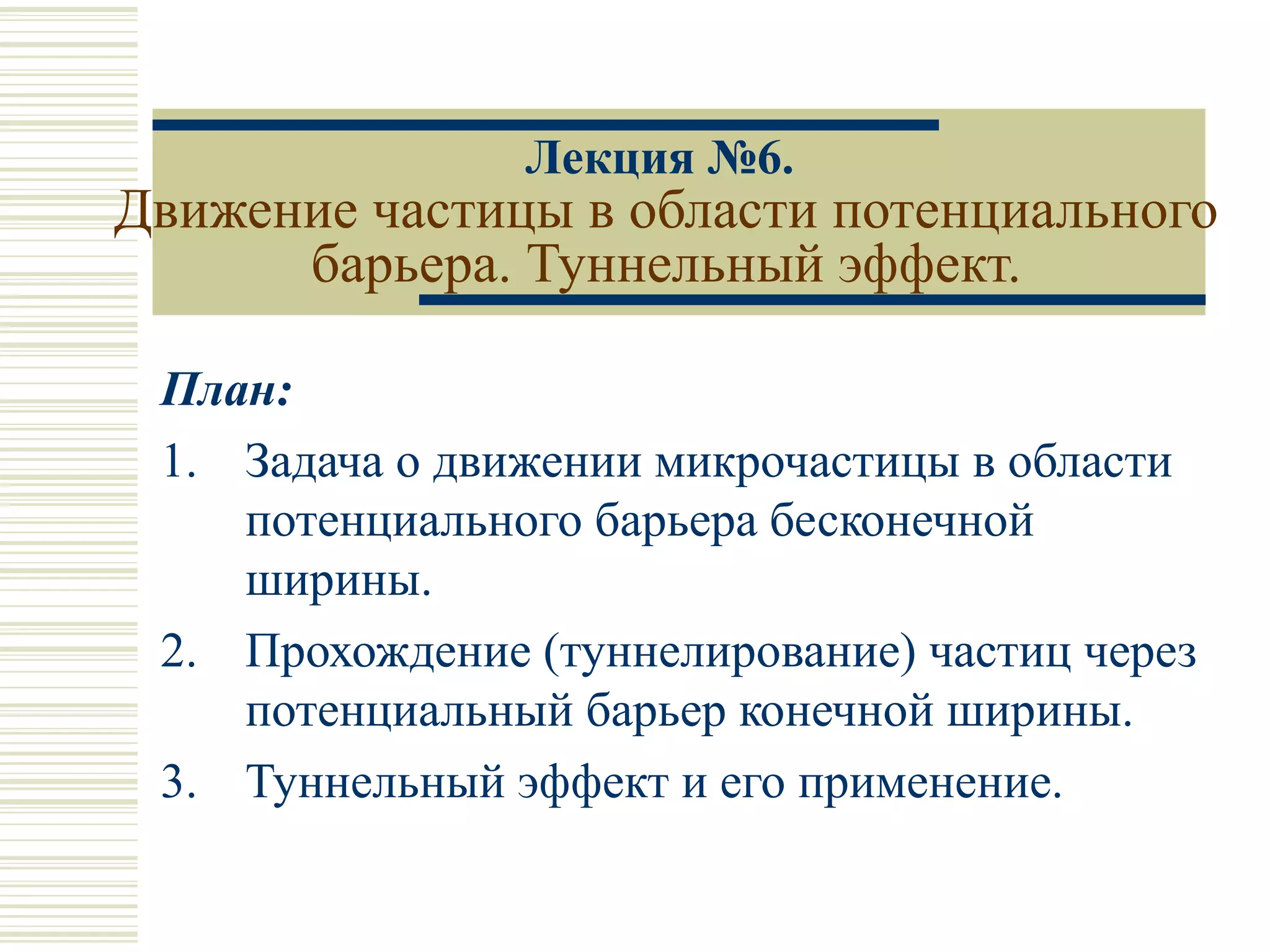 Лекция посвящена движению частиц в области потенциального барьера и туннельному эффекту. Рассматриваются математические модели для микрочастиц при высоких и низких потенциальных барьерах, а также применения туннельного эффекта в автоэлектронной эмиссией, радиоактивном альфа-распаде и работе сканирующего туннельного микроскопа. Обсуждаются технические детали и важность применения туннельного эффекта в нанотехнологиях.