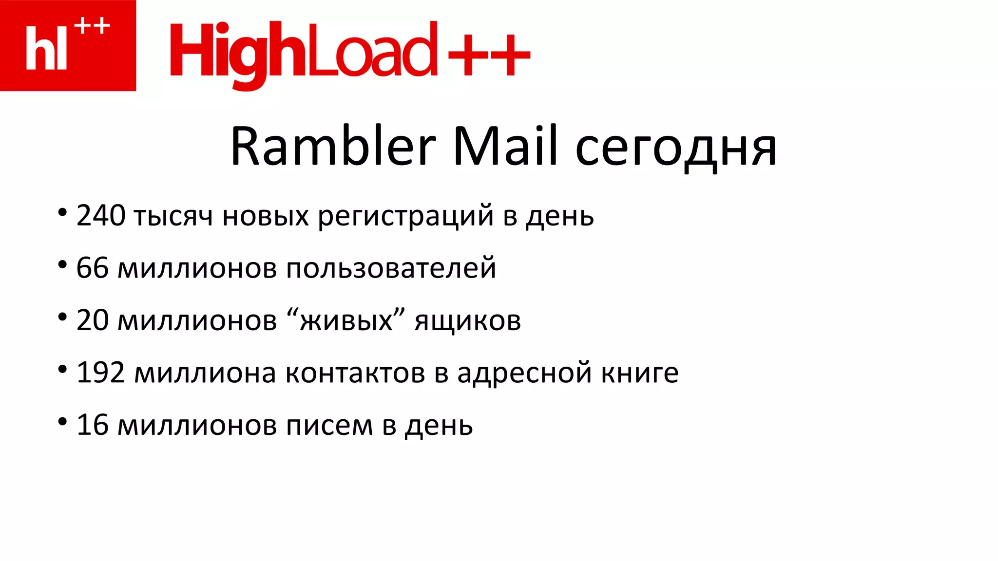 Документ описывает архитектуру почтового сервиса Rambler Mail, который учитывает 240 тысяч новых регистраций в день и 66 миллионов пользователей. В нем обсуждаются технологии и инструменты, используемые для создания и оптимизации сервиса, включая FreeBSD, MySQL, Nginx и различные методы кэширования. Также упоминаются аспекты разработки с использованием ORM и их влияние на производительность и ресурсные требования.