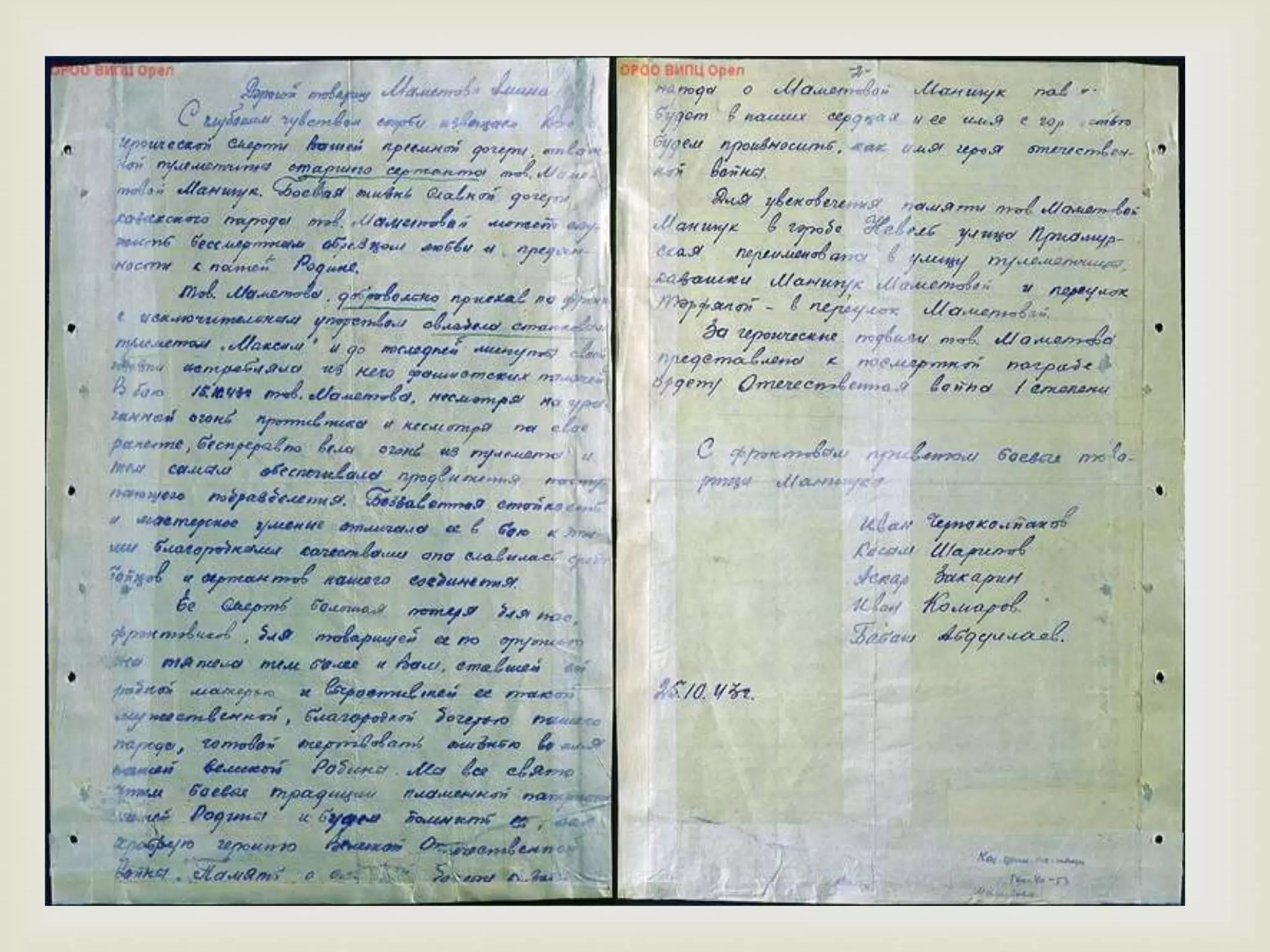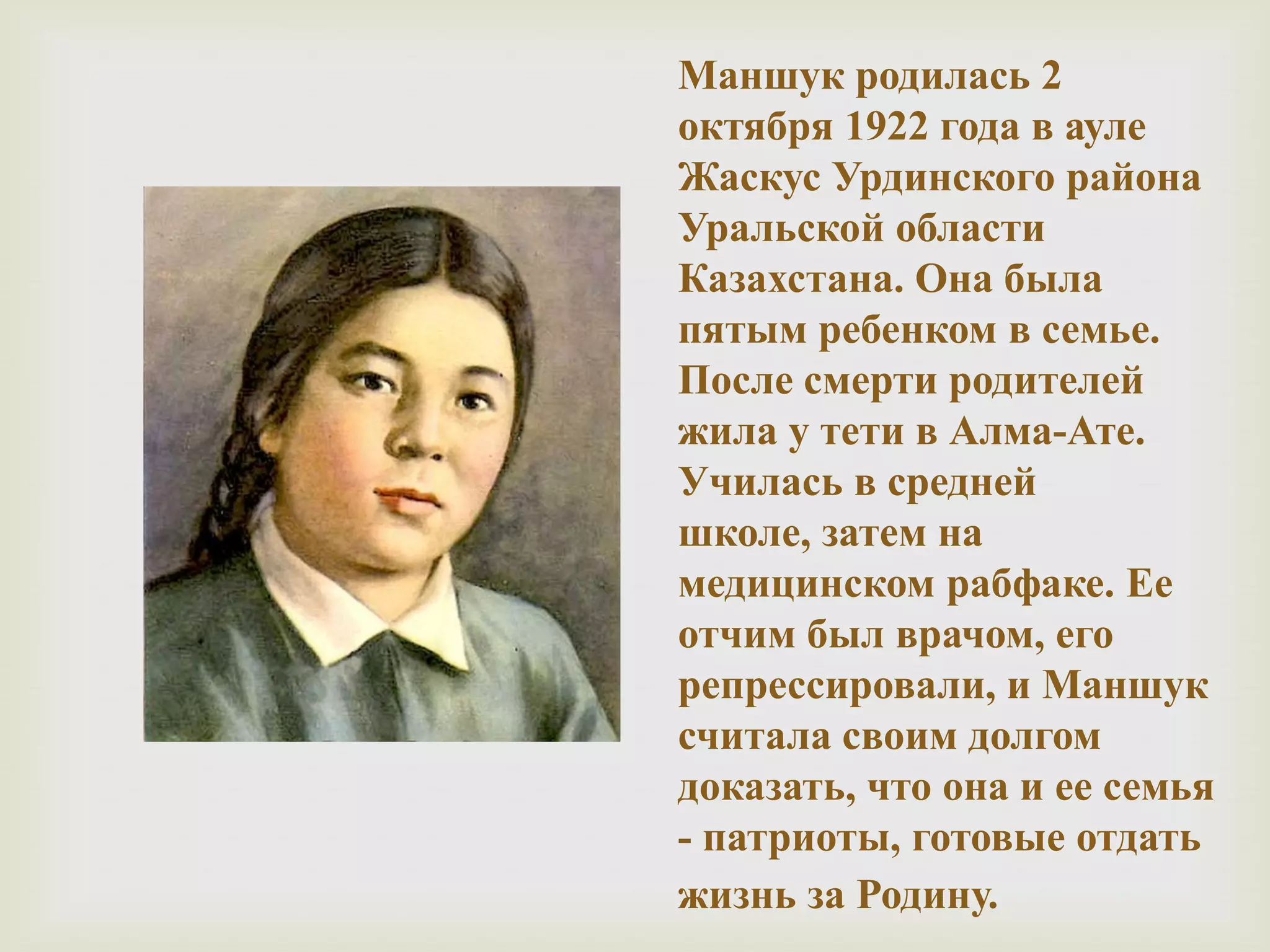 Маншук Маметова, родившаяся в 1922 году в Казахстане, стала выдающейся медсестрой и пулеметчицей во время Второй мировой войны. Она добровольно ушла на фронт, где проявила храбрость, участвуя в боях за освобождение Невеля, и продолжала сражаться даже будучи смертельно ранена. После войны ее память увековечена в литературе и кино.