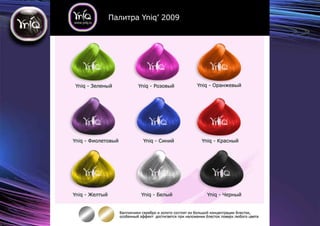 Документ описывает инновационное решение для уменьшения рекламных затрат и привлечения клиентов с помощью уникальной спрей-краски yniq в ярких цветах. Продукт безопасен, легко смывается и предлагает множество возможностей для активизации событий и создания интерактивного контента. Использование краски позволяет экономить на традиционной промо-форме и привлекает большее внимание к акциям благодаря ярким и насыщенным цветам.