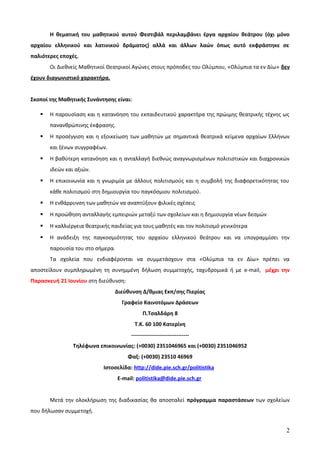Η θεματική τουμαθητικού αυτού Φεστιβάλ περιλαμβάνει έργα αρχαίου θεάτρου (όχι μόνο