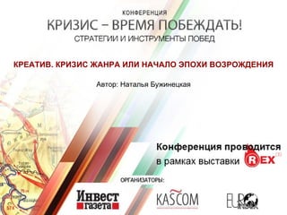 Документ обсуждает концепцию креатива в рекламе, подчеркивая важность нахождения эффективных решений для маркетинговых задач. Автор, Наталья Бужинецкая, акцентирует внимание на значимости упаковки идей и необходимости добавления реальной ценности продуктам в условиях кризиса. Реклама должна быть значимой и заметной, чтобы достичь своей цели.