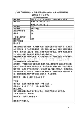 本課程報告探討立法學的重要性,鼓勵學生積極發表意見和參與立法過程。著重於社會共識的形成,並討論了例如死刑廢除等法律議題。課程還介紹了國會透明化及法律人對立法的參與角色,期望學生關注實務及未來的考試要點。