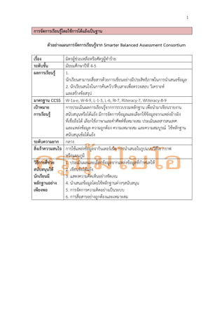 Balanced Assessment Consortium เรื่อง มิตรผูชวยเหลือหรือศัตรูผูทําราย ระดับชั้น มัธยมศึกษาปที่ 4-5 ผลการเรียนรู 1. นักเรียนสามารถสื่อสารดวยการเขียนอยางมีประสิทธิภาพในการนําเสนอขอมูล 2. นักเรียนสนใจในการคนควา/สืบเสาะเพื่อตรวจสอบ วิเคราะห และสรางขอสรุป มาตรฐาน CCSS W-1a-e, W-4-9, L-1-3, L-6, RI-7, Rliteracy-7, Wliteracy-8-9 เปาหมาย การเรียนรู การประเมินผลการเรียนรูจากการรวบรวมหลักฐาน เพื่อนํามาเขียนรายงาน สนับสนุนหรือโตแยง มีการจัดการขอมูลและเลือกใชขอมูลจากแหลงอางอิง ที่เชื่อถือได เลือกใชภาษาและคําศัพทที่เหมาะสม ประเมินผลสารสนเทศ และแหลงขอมูล ความถูกตอง ความเหมาะสม และความสมบูรณ ใชหลักฐาน สนับสนุนขอโตแยง ระดับความยาก กลาง สิ่งเราความสนใจ การใชแหลงขอมูลจากินเตอรเน็ต การนําเสนอในรูปแบบวีดีโอ กราฟ หรือแผนภูมิ วิธีการที่ชวย สนับสนุนให นักเรียนมี หลักฐานอยาง เพียงพอ 1. ประเมินผลและเลือกขอมูลจากแหลงขอมูลที่กําหนดให 2. เขียนขอโตแยง 3. แสดงความคิดเห็นอยางชัดเจน 4. นําเสนอขอมูลโดยใชหลักฐานตางๆสนับสนุน 5. การจัดการความคิดอยางเปนระบบ 6. การสื่อสารอยางถูกตองและเหมาะสม